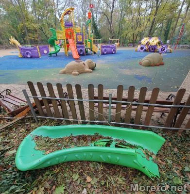 Освен счупената пързалка на територията на площадката е счупена една от пейките, както и част от оградата на. Щетите по тях обаче е вероятно да са вследствие на бурята.