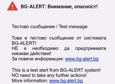 Днес е националният тест на BG-ALERT. При провеждането на теста в продължение на половин час от 12:00 до 12:30 ч. ще бъде излъчвано съобщение, съдържащо текст на български и английски език.