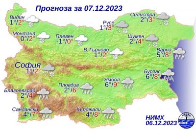 През нощта ще е облачно с валежи от дъжд главно в североизточната половина от страната. От север-северозапад ще започне да нахлува студен въздух и в северозападните и планинските райони дъждът ще премине в сняг. На места ще се образува снежна покривка. В Източна България ще духа до умерен вятър от север-североизток. Минималните температури ще са между минус 1° и 4°, малко по-високи в североизточните райони от страната, в София - около 1°. Утре ще продължи да вали, като в Северна България валежите временно ще отслабнат. Вятърът ще се ориентира от север-северозапад и ще е слаб до умерен. Максималните температури ще са от 1°-3° в Северна България до 7°-9° на изток, в София - около 2°.