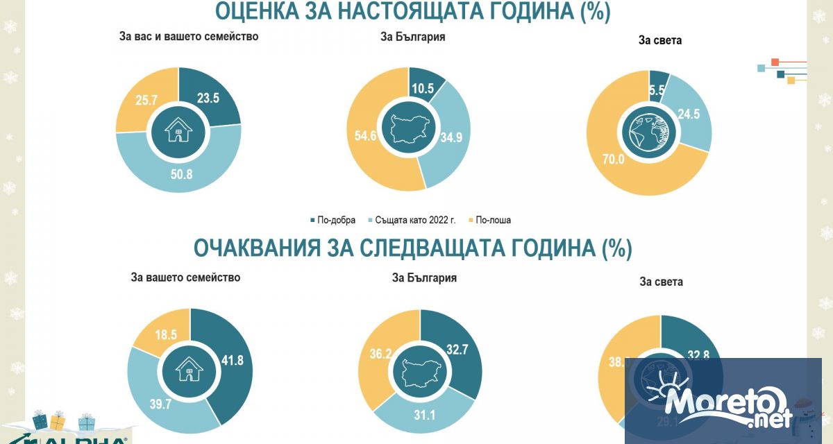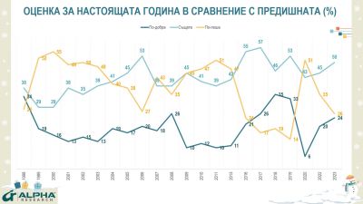 Въпреки тези кризи, оценките за изминалата 2023 г. са по-добри от тези преди една година. Основно, защото за пълнолетните българи тя е била по-успешна за тях и семействата им, отколкото за страната и света. Това показва проучване на "Алфа рисърч", проведено в края на ноември 2023.
