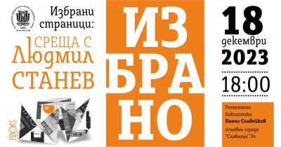 Свободни разговори за избрани страници от един непредвидим и безпогрешно разпознаваем варненски автор. Регионална библиотека „Пенчо Славейков” Варна, кани жителите на морската столица на среща с Людмил Станев и последната му книга „Избрано”, създадена заедно с Петър Желев и издателство „ПиБукс”.