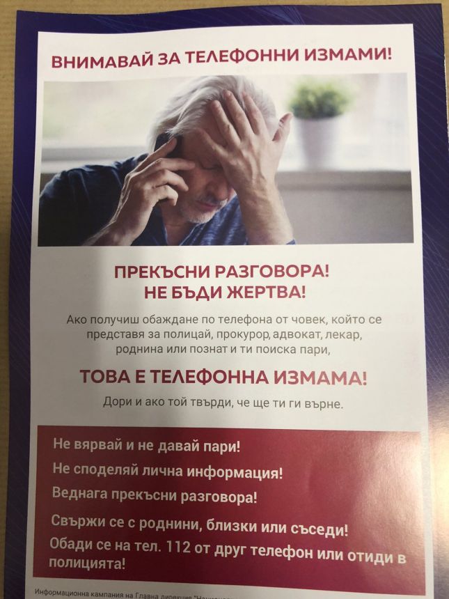 От полицията умоляват всички, които имат възрастни родители и роднини, да им обяснят за измамните схеми и сценарии и да ги предупредят да не дават по никакъв повод пари, искани по телефон.