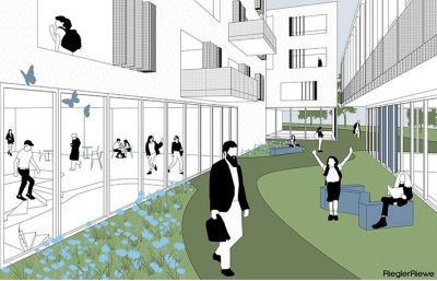 Според идейната концепция ще има няколко сгради в зелена зона. Върху единия от плоските покриви ще има игрище. Между зданията ще има усещане за малки улички. В парковата част ще има различни зони за спорт, които могат да се използват и от живущите в района. Предвидени са затворени класни стаи, но и много открити пространства за учене в общите части. Големите прозорци ще създават усещане за още по-голяма близост до природата. Всички сгради ще бъдат свързани с приземно ниво. Ще има зона за хранене.
