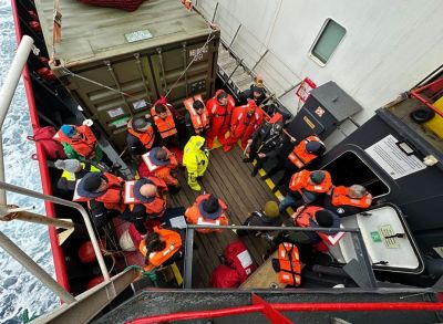 На участниците в 32-рата Българска антарктическа експедиция беше проведен инструктаж по мерки за безопасност, правила за действия при аварийна ситуация и използване на корабните индивидуални и колективни спасителни средства.