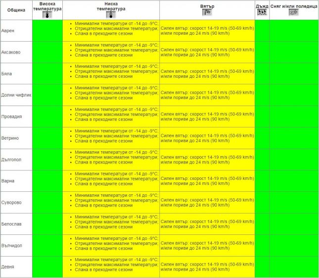 В област Варна за утре, 9 януари, е обявен жълт код за ниски температури и силен вятър. Ще духа силен север-североизточен вятър с пориви до около 20 m/s. Студено време, в много райони от областта и дневните температури ще останат отрицателни.