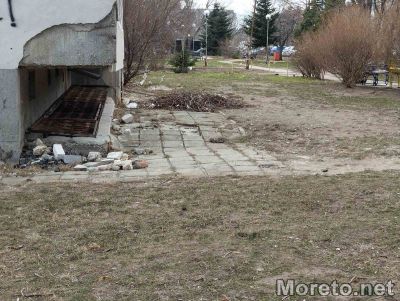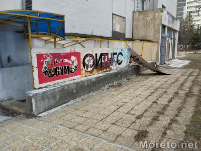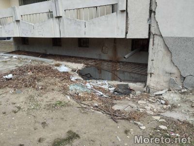 Фасадата на зданието на множество места се руши. Още стоят щетите от бурята през ноември, когато цели дограми от високите етажи бяха на косъм да се стоварят. Сега на тяхно място просто зеят дупки, видя репортер на Moreto.net.