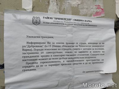 „Информираме ви за опасна, рушаща се сграда, находяща се на ул. „Дубровник“ блок 15 (бивше общежитие на Технически университет Варна). Поради износване на сградата, същата е негодна за ползване, застрашена от самосрутване, опасна за здравето и живота на гражданите, вредна в санитарно – хигиенно отношение. Сградата към настоящия момент не може да бъде поправена или заздравена.