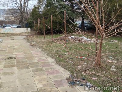 Около блока има останки от обезопасителни ленти, опънати явно, за да напомнят на гражданите да бъдат бдителни при преминаване и да стоят на разстояние.