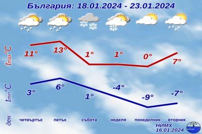 Това се посочва в седмичната прогноза за времето у нас (18 - 23 януари) на Националния институт по метеорология и хидрология (НИМХ).
