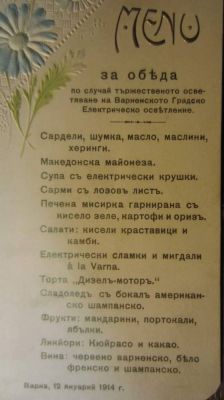 На 1 януари 1914 г. за първи път е включено уличното електрическо осветление във Варна. На 12 януари електрическата централа е тържествено открита от кмета Александър Василев, а митрополит Симеон извършва водосвет. На същия ден компанията „Сименс & Шукерт – Виена“ организира банкет във Военния клуб. Интерес предизвиква менюто на банкета – в него присъстват „супа с електрически крушки" и "торта „Дизел-мотор“.