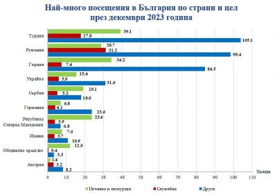 Най-много посещения в България са реализирали гражданите от: Турция - 162.0 хил., Румъния - 158.3 хил., Гърция - 126.1 хил., Украйна - 52.3 хил., Сърбия - 42.3 хил., Германия - 34.5 хил., Република Северна Македония - 34.3 хил., Италия - 22.2 хил., Обединено Кралство - 15.7 хил., Австрия - 12.8 хиляди.