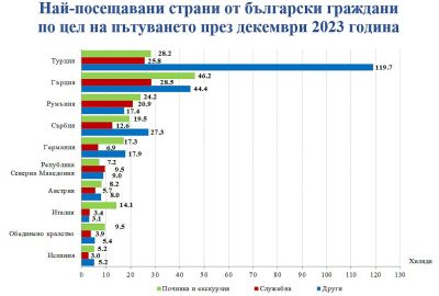 Най-голям брой пътувания на български граждани са осъществени към: Турция - 173.7 хил., Гърция - 119.1 хил., Румъния - 62.5 хил., Сърбия - 59.4 хил., Германия - 42.1 хил., Република Северна Македония - 25.7 хил., Австрия - 21.9 хил., Италия - 20.6 хил., Обединено кралство - 18.8 хил., Испания - 13.4 хиляди.