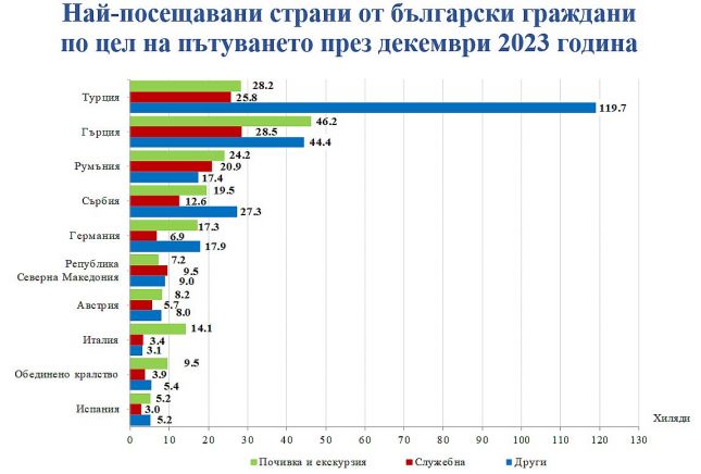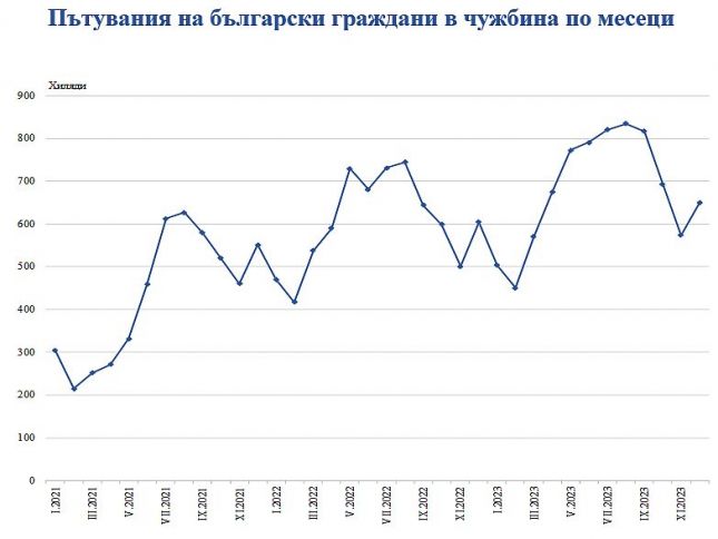 Пътуванията на български граждани в чужбина през декември 2023 г. са 649.1 хил. или със 7.3% повече от декември 2022 година. Регистрирано е увеличение на пътуванията по всички наблюдавани цели - почивка и екскурзия, служебна и други цели.