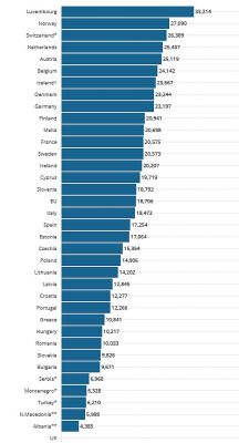 Цифрата беше над 35 000 евро в пет държави, а именно Швейцария (44 753 евро), Исландия (39 918 евро), Норвегия (39 206 евро) и Обединеното кралство (37 934 евро), в допълнение към Люксембург. Той е 25 000 евро в Германия и 23 053 евро във Франция.