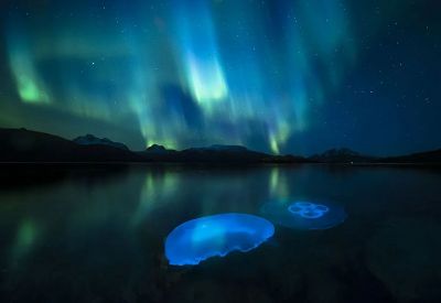 Подслонявайки оборудването си в собственоръчно изработен водоустойчив корпус, Аудун Рикардсен използва собствената си система за регулиране на фокуса и блендата по време на една експозиция, докато лунните медузи гъмжаха в хладните есенни води на фиорд край Тромсьо, в Северна Норвегия, осветен от Северно Сияние.