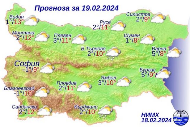 През следващото денонощие облачността над страната ще е значителна, но само на отделни места ще превали слаб дъжд, в планините - слаб сняг. Ще духа слаб, в източните райони до умерен североизточен вятър. Минималните температури ще бъдат между минус 1° и 4°, а максималните - между 7° и 12°. В София минимална температура около минус 1°, максимална - около 9°.