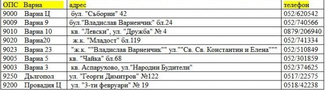 Списък с пощенски клонове в населените места, където се приемат ГДД по чл. 50 от ЗДДФЛ във Варна и областта: