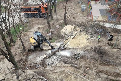 При изграждането на паркинг зад бл. 3 на ул. „Студентска“, над ул. „Цани Калянджиев“, служители на дружеството, изпълняващо строително-монтажни работи на обекта, самоволно са отрязали едно дърво от вида Копривка.
