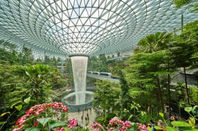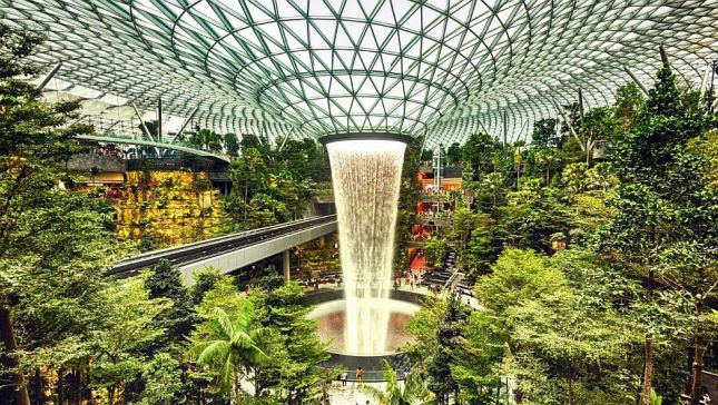 Сингапурското летище Jewel Changi е скорошно допълнение към комплекса на летище Changi и е комплекс със смесено предназначение, насочен към създаване на обществен център в летищно съоръжение и също така функционира като централен свързващ елемент между съществуващите летищни терминали. Воден от израелско-канадския архитект Моше Сафди и неговата фирма Safdie Architects, в сътрудничество с редица други фирми и консултанти, най-ангажиращият елемент на проекта е неговият вътрешен водопад, най-високият в света до момента. Летище Jewel Changi е прикрепено към залата за пристигащи на Терминал 1 на летище Чанги в Сингапур и има тороидална форма.