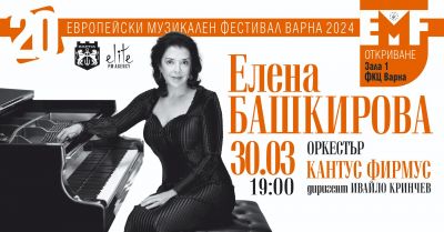 Звездата на концерта, с който се открива юбилейното ХХ издания на Европейския музикален фестивал Варна - забележителната пианистка Елена Башкирова, пристига от Берлин за първи гастрол във Варна. Очакванията на познавачите са големи, защото Башкирова-Баренбойм е признат интерпретатор на Моцартовото клавирно творчество. В нейно изпълнение заедно с оркестър Кантус Фирмус с диригент Ивайло Кринчев ще прозвучи рядко изпълнявания у нас Концерт за пиано и оркестър № 13 в до мажор на великия композитор.