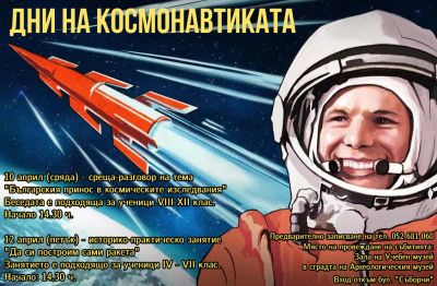 На 12 април ще отбележим заедно 90-тата годишнина от рождението на първия човек, полетял в Космоса – Юрий Гагарин и 63-тата годишнина от неговия полет. След кратка историческа презентация, учениците ще имат възможността да изработят от хартия сами макет на ракетата, с която Гагарин е полетял на 12 април 1961 г.