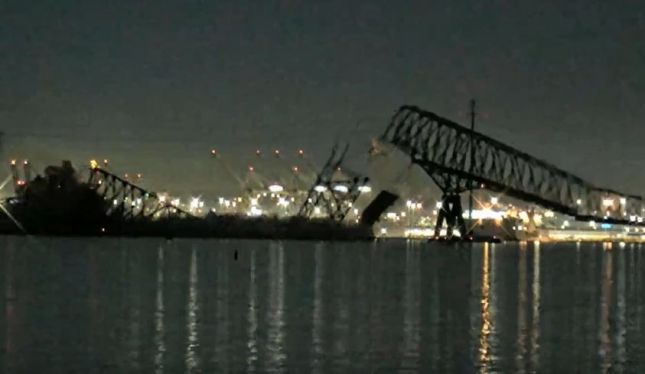 Мостът "Франсис Скот Кий" в американския град Балтимор се срути, след като беше ударен от товарен кораб, а множество превозни средства паднаха във водата, съобщава Асошиейтед прес.