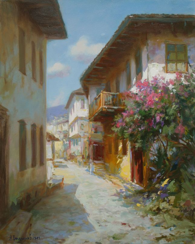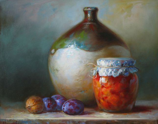Тази изложба ни пренася някъде другаде. Тя е вълшебен свят, в който времето е спряло. Тя е СЪЗЕРЦАНИЕ. Всяка една творба е родена от финото, почти въздушно съприкосновение на четката с платното. Пренася ни епохи назад, когато реалистичната живопис е заемала своето достойно място в изложбените салони и домовете ни. Всеки детайл е прецизиран и изпипан до съвършенство: цветята греят с пищната си багреност, стъклото и порцелана блестят в своята уязвима крехкост, снегът е чист и ослепително искрящ, старите къщи, запазили своята достолепност, хвърлят сенки върху огрени от слънце и пълни с живот улички и площадчета …