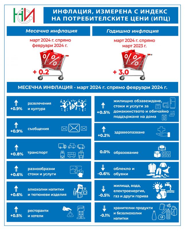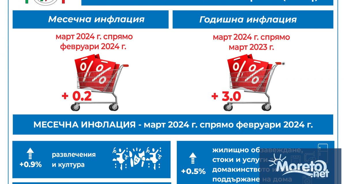 През март 2024 г. месечната инфлация е 0.2%, а годишната инфлация за март 2024 г. спрямо март 2023 г. е 3.0%.