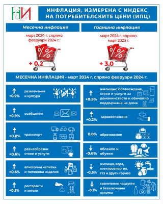 Инфлацията от началото на годината (март 2024 г. спрямо декември 2023 г.) е 1.0%, а средногодишната инфлация за периода април 2023 - март 2024 г. спрямо периода април 2022 - март 2023 г. е 6.5%.