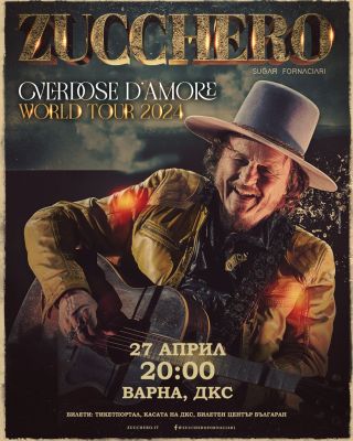 Билетите за големия концерт на Zucchero на 27 април в Дворец на културата и спорта – Варна, се продават с пълна сила в системата на Ticketportal.bg и Eventim.bg, и на касата на залата. Цената им е от 50 до 120 лв. за билет според мястото.