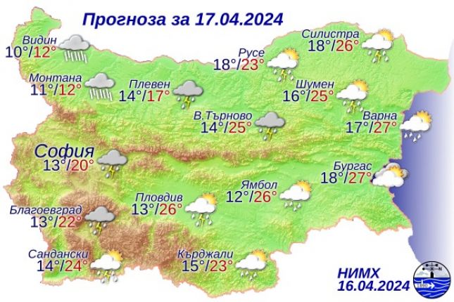 Утре ще се развива купеста и купесто-дъждовна облачност и ще има валежи от дъжд, на повече места и по-интензивни ще са след обяд и вечерта, като в Западна България се очакват значителни количества. Ще има и гръмотевични бури и условия за градушки. В Югоизточна България ще се задържи почти без валежи, но през нощта срещу четвъртък и там ще завали. В северозападната половина от страната вятърът ще е до умерен от запад-северозапад, докато в югоизточната ще се задържи от юг-югозпад и ще е временно силен. Максималните температури ще са от около 12° в крайните северозападни райони, до 27° на места в Източна България, в София – около 20°.