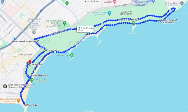 От входа на Морската градина по централната алея в посока север, покрай Братската могила, Зоологическата градина, Делфинариума, до края на градината, спускане до Крайбрежната алея, покрай 4-та и 3-та буна, по Крайбрежната алея покрай брега до южния край на Морската градина и пристанище Варна. Почивка, обща снимка и връщане през западната алея на Морската до финала при Слънчевия часовник.