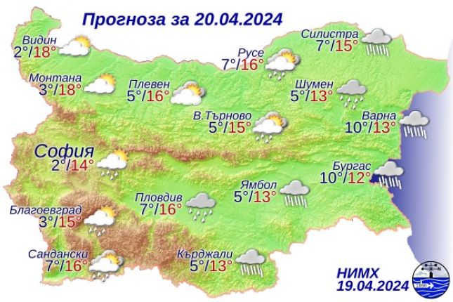 През следващото денонощие над източната половина от страната ще е облачно с валежи от дъжд. На места валежите ще са интензивни и значителни по количество. Над западната половина облачността ще се разкъса и намалее, през деня до предимно слънчево. След обяд от запад отново ще се увеличи и на места главно в планинските райони там ще превали дъжд. Ще духа слаб до умерен вятър от север-североизток, който до вечерта ще се ориентира от северозапад и в Източна България ще е умерен. Минималните температури ще бъдат между 2° и 7°, в котловините на Югозападна България до 0°. Максималните температури ще бъдат между 13° и 18°. В София минималната ще е около 2°, максималната - около 14°.