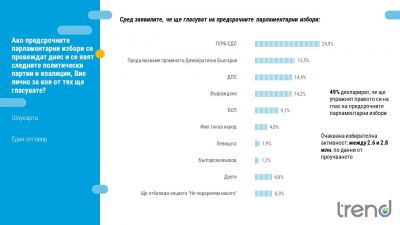 „Тренд”: Над 9% разлика между ГЕРБ-СДС и ПП-ДБ за предстоящите избори