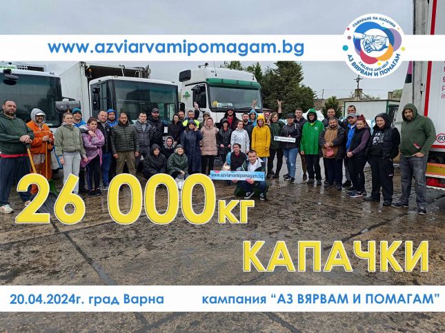 26 000 кг капачки са събрани миналия уикенд във Варна по време на юбилейното 10-то на брой мащабно събитие за събиране на капачки, стотинки и парични дарения „Празник на рециклирането „Аз Вярвам и Помагам“.