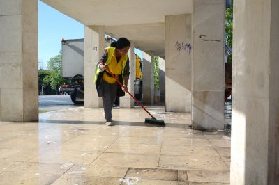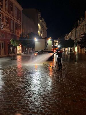 Почистването започна с измиване на пешеходната зона, водеща до пл. Независимост, самия площад и ларгото към Морската градина. Почистени с препарати и дезинфекцирани бяха пейки и кошчета. Кметът Благомир Коцев контролираше дейностите по почистване в центъра на града още от полунощ.