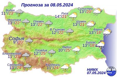През нощта над югоизточната половина от страната облачността ще е разкъсана, докато над останалата част ще е значителна и на места ще има валежи от дъжд. Ще е почти тихо. Минималните температури ще бъдат между 9° и 14°, в София - около 9°. Утре ще се развива купеста и купесто-дъждовна облачност. Около и след обяд на много места ще има краткотрайни валежи, придружени с гръмотевици. Ще има условия за градушки. Значителни по количество ще са валежите в Западна и Централна България. Ще духа слаб до умерен вятър от изток-североизток и с него ще започне да нахлува хладен въздух. Максималните температури ще бъдат между 20° и 25°, в София 20°.
