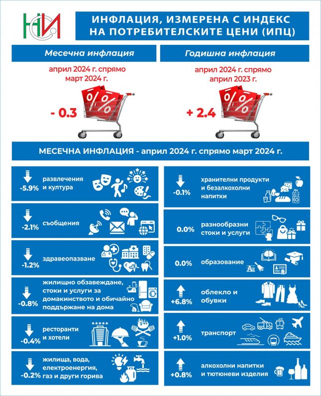 През април 2024 г. месечната инфлация е -0.1%, а годишната инфлация за април 2024 г. спрямо април 2023 г. е 2.5% .