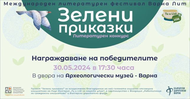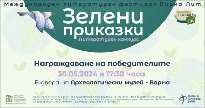 Във Варна ще наградят победителите в конкурса „Зелени приказки“. Всички участници, приятели, родители и съмишленици на „Варна Лит“ са поканени на 30 май в 17.30 часа в двора на Археологическия музей във Варна.