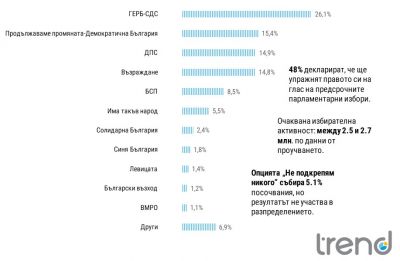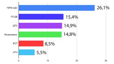 Ако изборите за Народно събрание се провеждат днес – ГЕРБ събира 26,1% подкрепа сред гласуващите и ще има комфортна преднина пред втория с малко над 10%. Следва група от три политически формации са със сходни резултати, които ще се борят за втората позиция - ПП-ДБ (15.4%), ДПС (14.9%) и Възраждане (14.8%).