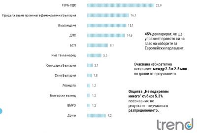 Няма сериозна разлика в предпочитанията на българите между изборите за национален и европейски парламент. Очаква се малко по-силен резултат на европейските избори за коалицията ПП-ДБ (16.1%) и Възраждане (15.1%). За БСП резултатът за евролистата ще бъде по-слаб в сравнение с националния вот.