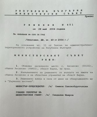 Точно преди 20 години – на 28 май 2004 г, с решение № 451 на правителството на Симеон Сакскобургготски, село Аксаково стана град. Решението за промяната на статута е на основание чл. 33 от Закона за административното устройство на Република България, а влизането му в сила е от датата на обнародване - в брой 49 от 2004 г.