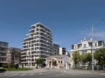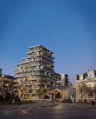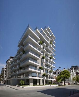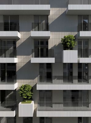 Общият обем на зданието е разделен от хоризонтални бели призми - балкони, които на места са прекъснати от кубични кашпи с дървета по цялата височина на фасадите подобно на морзова азбука.