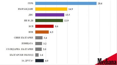 Медиана: Ако изборите са днес - ГЕРБ-СДС - 28,6%, "Възраждане" - 14,9%, ДПС - 13,5%, ПП-ДБ - 12,9%