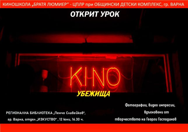 От 16.30 часа днес, 12 юни, в отдел „Изкуство“ – Регионална библиотека „Пенчо Славейков“ ще се състои откритият урок на децата от киношкола „Братя Люмиер“, към Общински детски комплекс, гр. Варна. Тази година те приключват своята работа с различни късчета кино - акцент на упражненията им е поезията на Георги Господинов. Бъдещата публика ще сподели с тях впечатления и вълнения, стилизирани в рамката на кинематографичността. Сред по-интересните творби са: „Залезът“ на Божана Станева, „Тръгваме ли?“ на Росен Бачев и „Носталгия“ на Манол Михов.