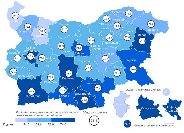 Средната продължителност на живота в областта е с 0.9 години по-висока от средната за страната - 73.5 години.