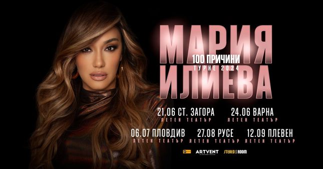 Стара Загора, Варна и Пловдив са първите три града, които ще имат поне 100 причини да се насладят на музиката на Мария Илиева. Датите са съответно 21 и 24 юни и 6-ти юли. Всички деца до 12 години влизат безплатно на концертите.