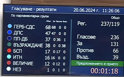 За нея гласуваха 131 народни представители "за,", 66 - "против" и 39 се въздържаха. Общо гласуваха 236 депутати.