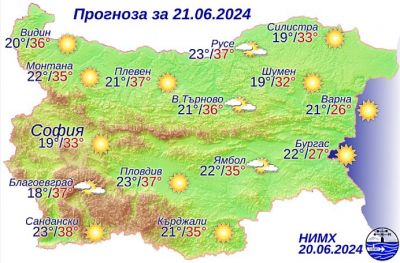 През нощта ще бъде предимно ясно, в повечето райони - почти тихо. Утре ще бъде предимно слънчево и горещо. В източната половина на страната ще духа слаб до умерен вятър от изток-североизток, в западната ще е почти тихо. Максималните температури ще бъдат между 33° и 38°, в Източна България - малко по-ниски, в София - около 33°.
