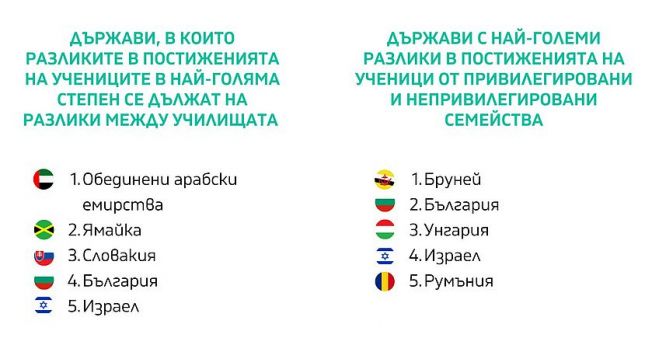 Подобно е положението и с фактора вид на училището. Над 50% от разликите между учениците в България се обясняват с разлики между училищата – страната е на четвърто място в това отношение сред всички изследвани. Държавите с високи постижения осигуряват добро ниво във всички училища и делът на междуучилищните разлики е сведен до минимум. България за поредна година не успява да се справи в това отношение.
